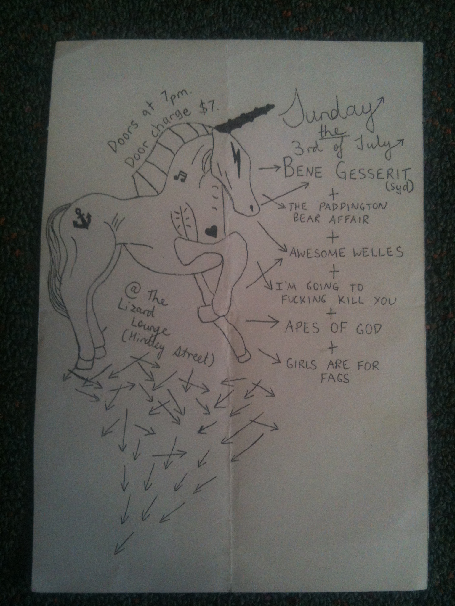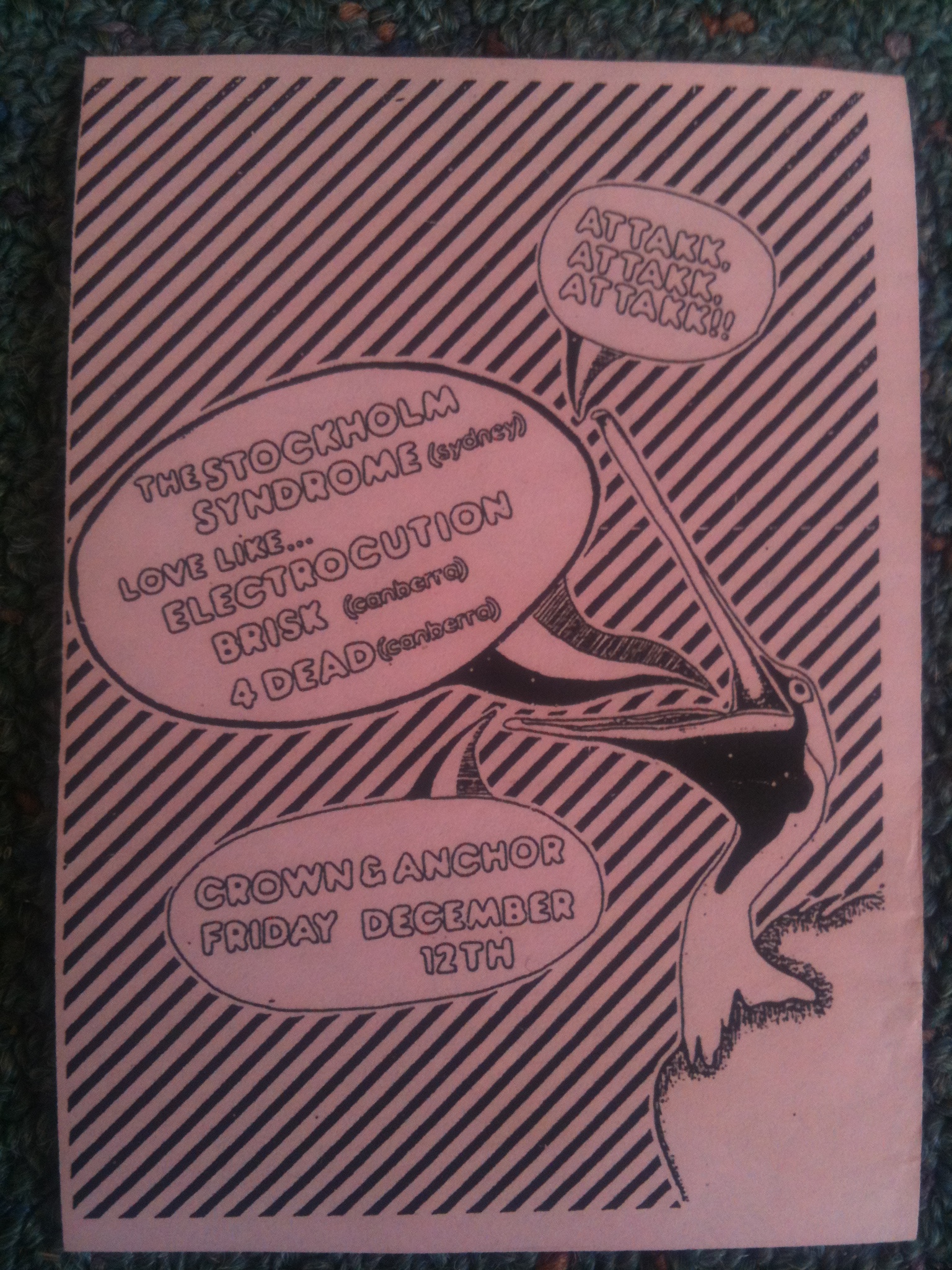 When I first started this blog last year, I talked in this post about my collection of flyers for gigs around Adelaide that I had collected over the last decade. As I have a bit more proficient with blogging, I thought I’d post some of my collection in stages here. I hope you enjoy this trip…