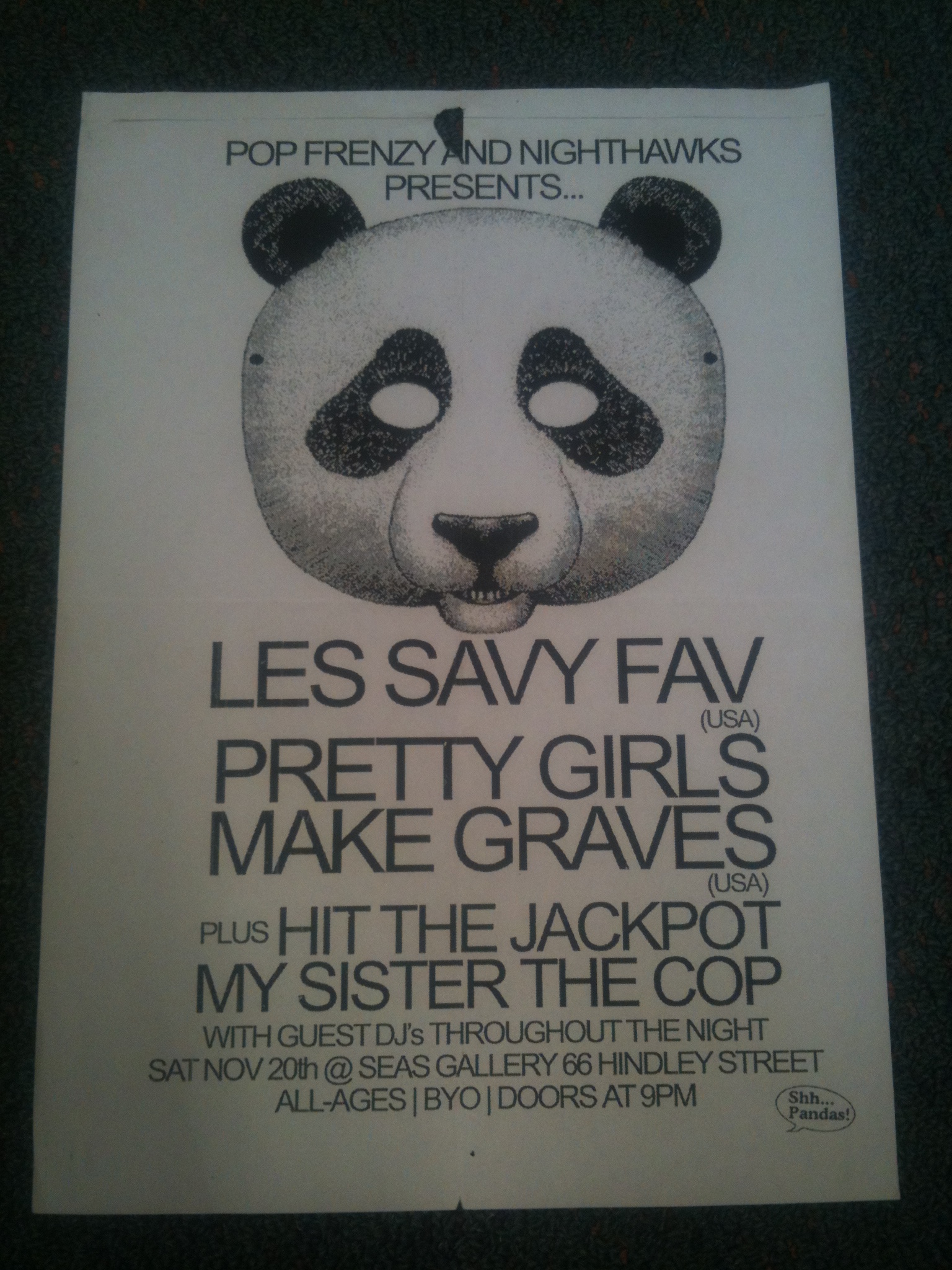 IMG_2272Another show at Avalon/SEAS. This gig was famous for two things. Firstly, the vocalist for Pretty Girls Make Graves was sick, so people from the audience were recruited to sing with the band. Secondly, the vocalist from Les Savy Fav was mental – I remember him running up the stairs out of the venue as far as the mic lead could let him.