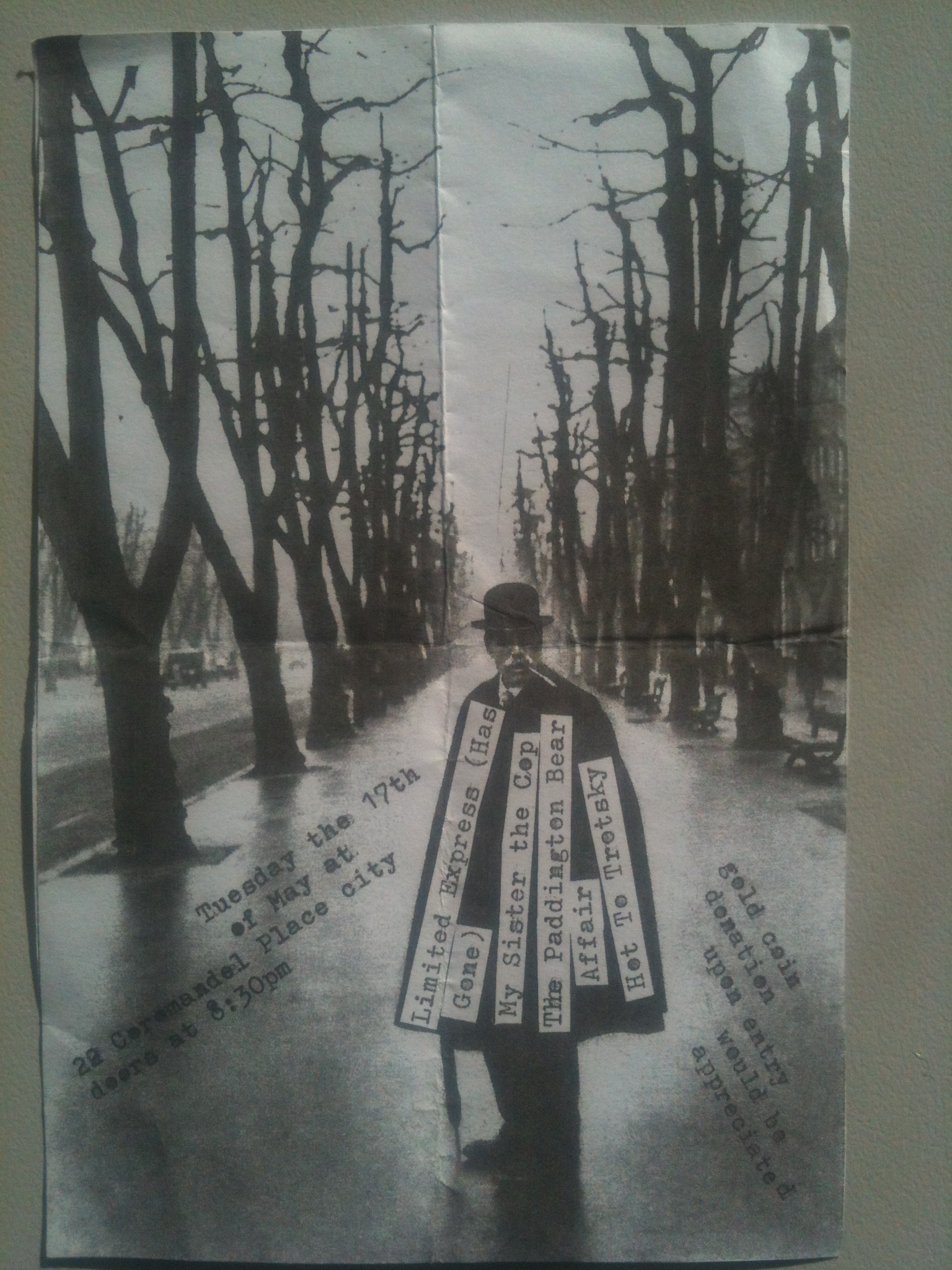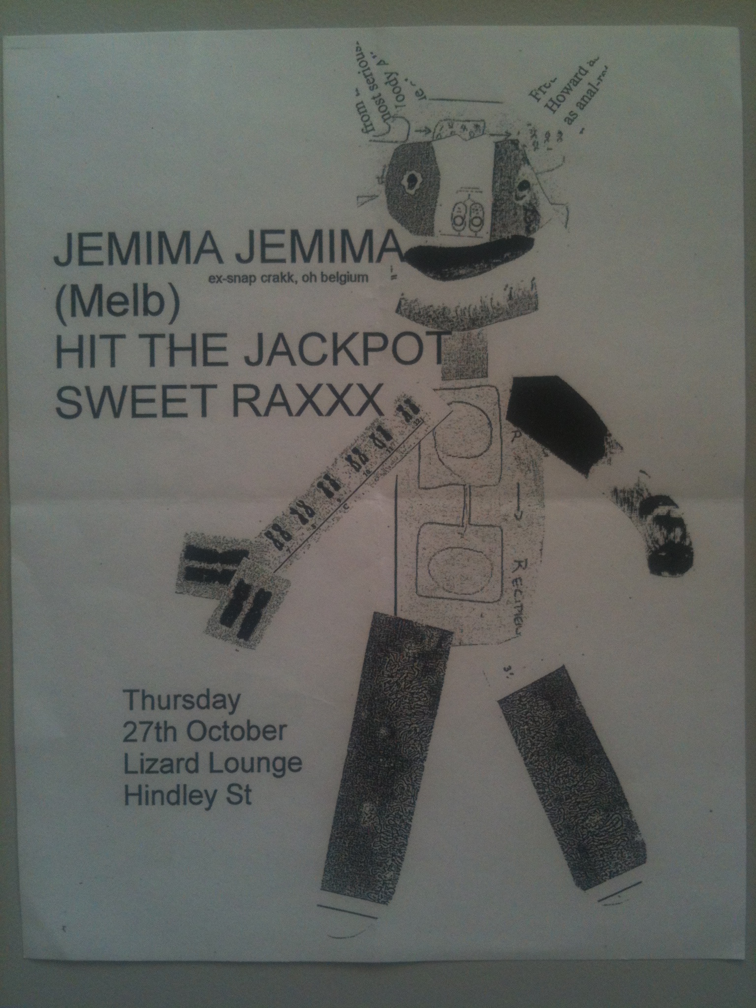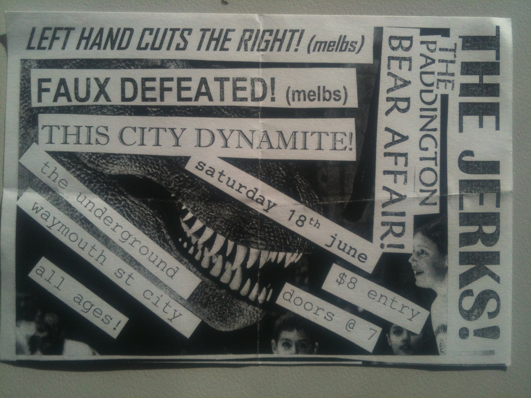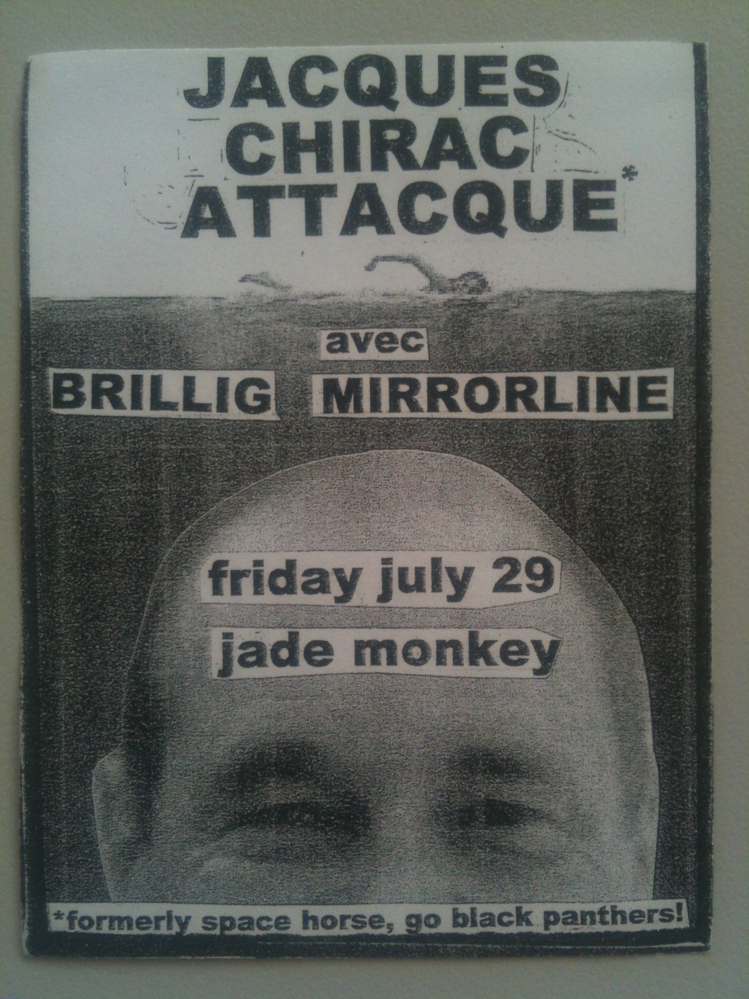 Jacques Chirac Attacque was my band’s name for this show only. We had a policy of changing our name for each gig. As the flyer says, we were also Space Horse and Go Black Panthers! at different shows, as well as Jimmy Floyd and the Hasselbainks, Not in the Face, Time for a Tiger, Hot to Trotsky, the Hated Salford Ensemble, Stroszek, and Mike Rann and the Mechanics, amongst others. This show sticks out in my memory for two reasons. Firstly, while the Jade Monkey was a well-known Adelaide music venue, our drummer had never played there and got lost, only arriving two minutes before we were supposed to go on stage. Secondly, we took the French theme seriously and had a fight with baguettes on stage during our last song.