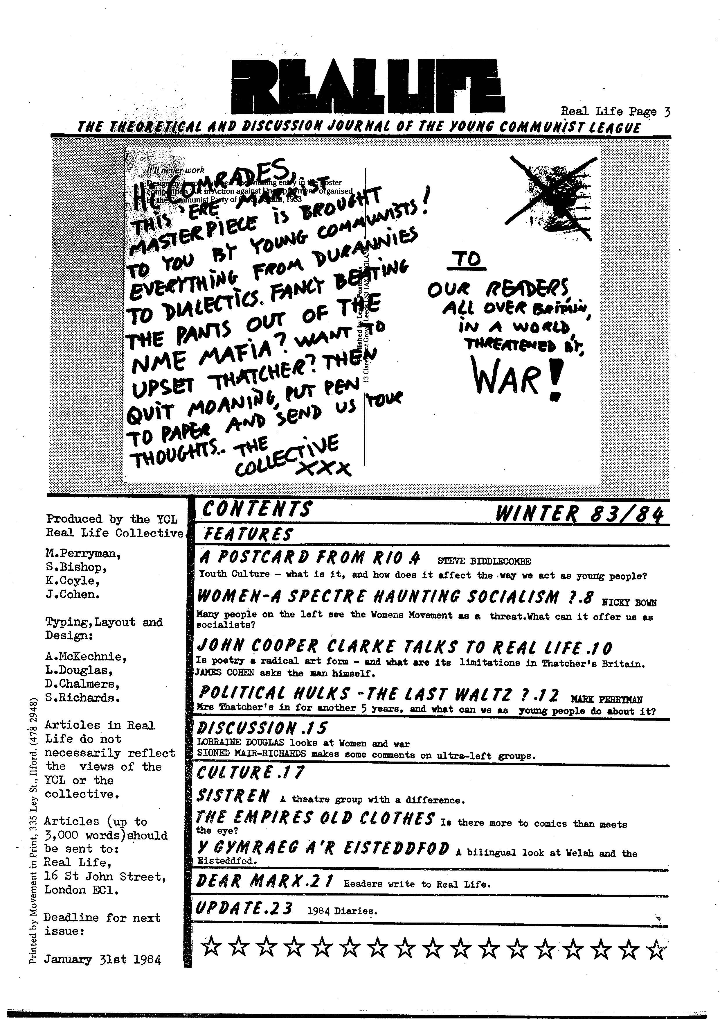 Real Life was a short-lived magazine produced by the Young Communist League during the early-to-mid-1980s and with the tagline of ‘the theoretical and discussion journal of the YCL’, it looks like it was the 1980s version of the 1960s/70s YCL mag, Cogito. The contact address was the CPGB/YCL offices on St. John Street in London, so it looks as though Real Life was aimed at national distribution, unlike other YCL journals, which were photocopied and distributed at district level around the same time. However the reach of the magazine was probably limited because, as discussed in this article, the YCL was collapsing in the 1980s.