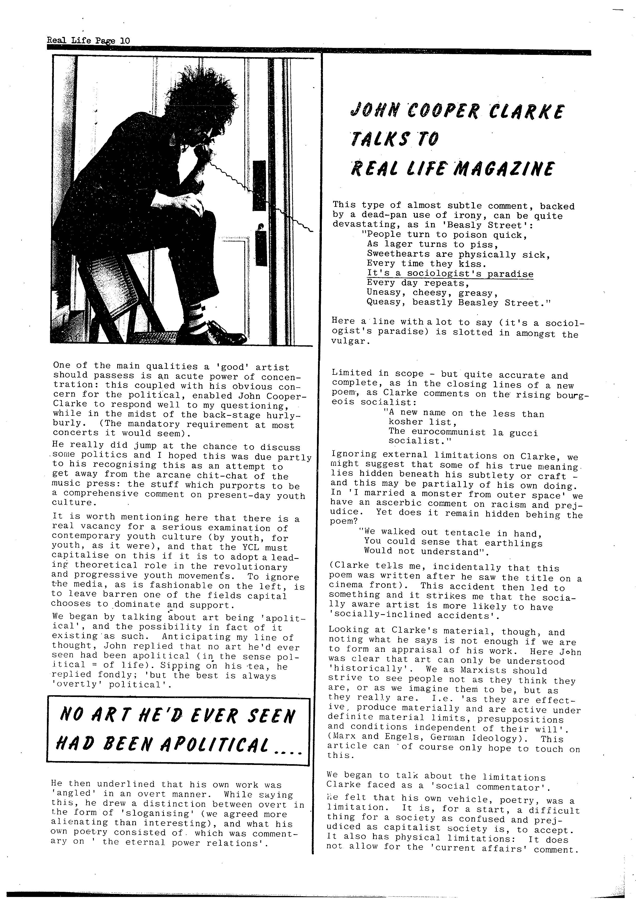 Interview with John Cooper Clarke in Young Communist League’s Real Life (1983/84)