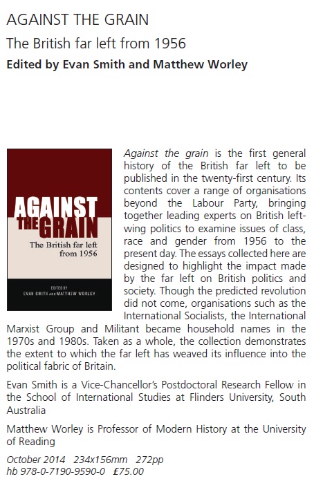 The latest catalogue from Manchester University Press features our new edited collection Against the Grain: The British Far Left from 1956 (on page 60). Here is what it says about our book:
