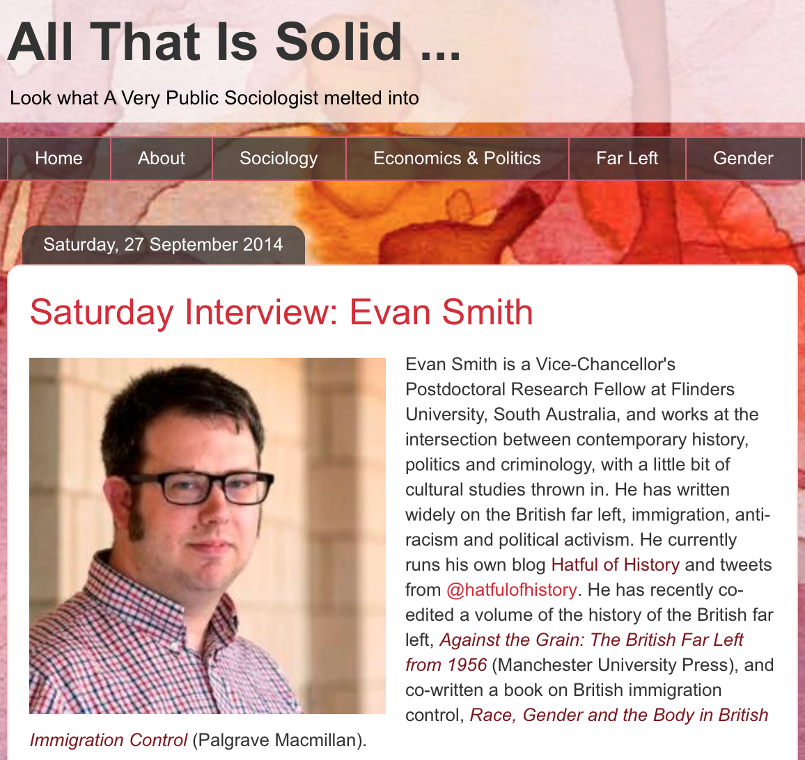 Every Saturday Phil BC at All That Is Solid… blog interviews a labour-y blogger person, asking a set set of questions. This Saturday Phil BC profiled me, asking me questions about blogging, academia and left-wing politics (amongst other things). You can read my very insightful answers here.