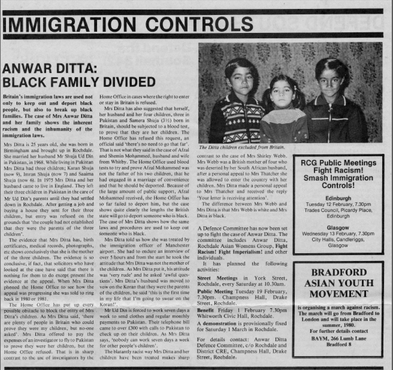 In accounting for his decision (reprinted by the ADDC in numerous pamphlets and leaflets), the Adjudicator stated that the ‘oral testimony could be sufficient to tip the balance in the appelants [sic] favour’ (our emphasis), but that he deemed the witnesses in the case to not be credible, stating, ‘[t]he parents of the appelants [sic] have on their own admission on several occasions lied to, or deceived, persons in official positions both in the UK and Pakistan’. The Adjudicator thus based his decision on the ‘credibility’ of the adult witnesses in the case, as well as on the long and complex history of Ditta and Ud Din’s marriage and immigration status; however, the decision was supposed to ascertain whether the children could enter the UK as Ditta’s children. As an ADDC bulletin from February 1981 stated, ‘[t]he only issue relevant to the case was whether Anwar was the parent of the three children’. In an article for the New Statesman, David Holmes cited the Adjudicator as saying that the documents outlining the relationship between Ditta and her children were ‘too few in number to outweigh the deficiencies in the oral evidence’, but pointed out that ‘in a rather careless sentence’, the Adjudicator actually referred to Ditta and Ud Din as ‘the parents of the appellants’ (our emphasis).[11]