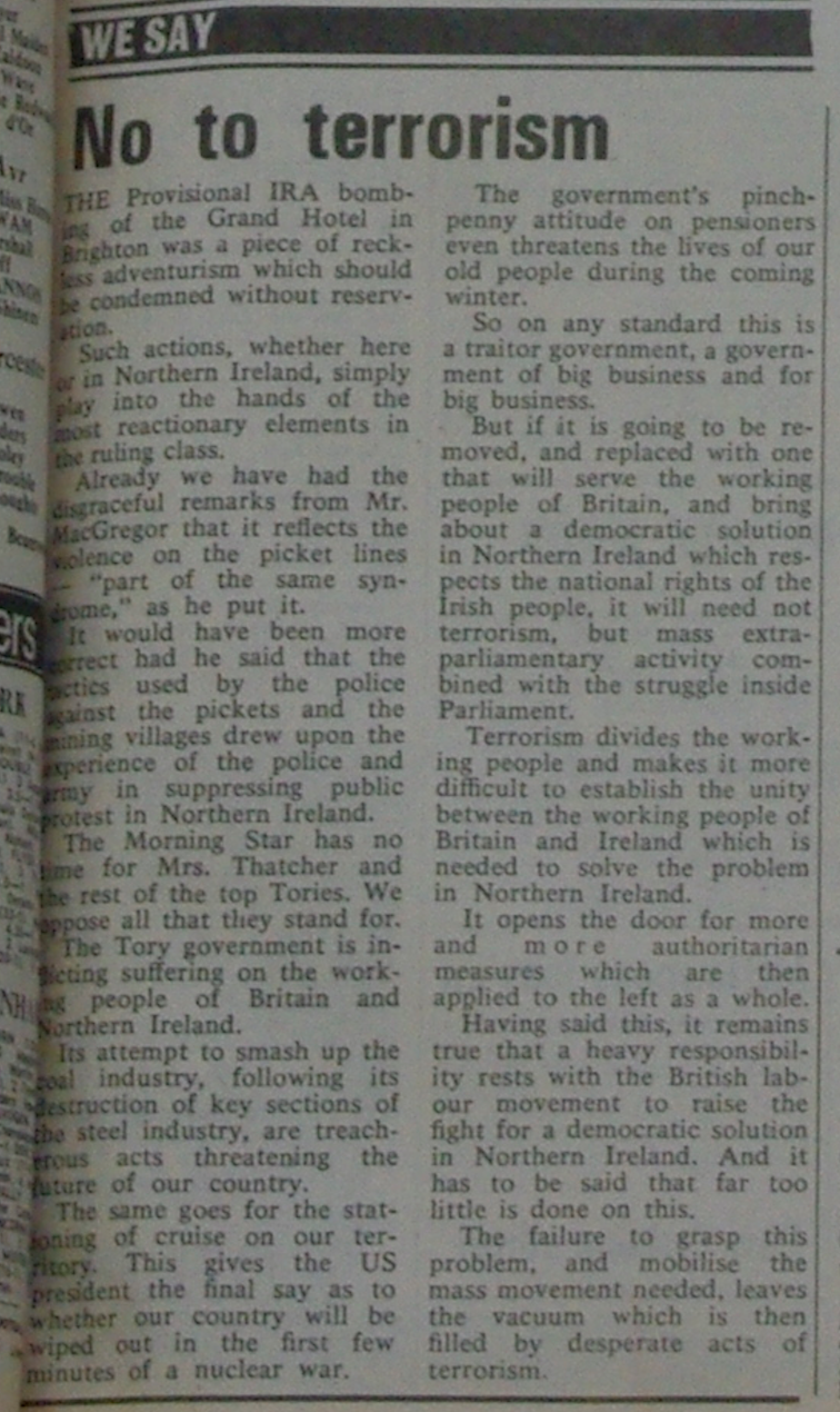 As a way of bit of background information, the Communist Party of Great Britain, to which the Morning Star was still nominally attached at this stage, was opposed to the bombing campaign of the Provisional IRA. At the Party’s 1981 Congress, a resolution on Ireland stated: