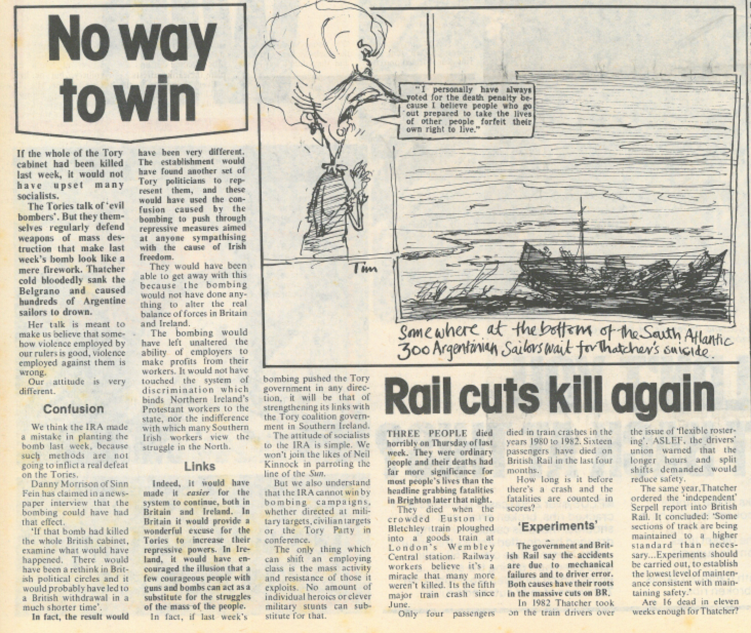 The Socialist Worker in the week following the bombing (20 Oct) did not put the bombing on the front page, instead focusing on the breakdown of ACAS proceedings between the NUM and the government. Coverage of the bombing was relegated to page 2. The paper featured two articles detailing the violence of the British Army and the RUC in Northern Ireland, explaining why the Provisional IRA enjoyed popular support. And like the Morning Star, the paper carried a statement from the SWP on the bombing under the headline ‘No Way to Win’. This statement acknowledged that many socialists would not have been upset if the bombing had inflicted more casualties amongst the Conservatives, but still condemned the bombing as the incorrect way to defeat Thatcher and to remove the British from Northern Ireland. The paper said: