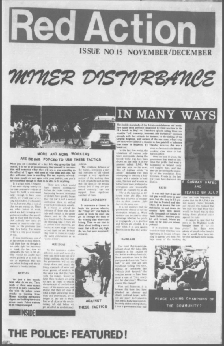 Issue 15 of Red Action from November 1984 contrasted the IRA bombing with the sinking of the Belgrano by the British (under Thatcher’s orders) during the Falklands War and argued that violence was given a moral worth depending on who perpetrated it. The paper noted that the reaction from the working class towards the bombing was quite muted and that this had changed from the anti-Irish sentiment that was prevalent during the 1970s. It was argued that this latest bombing incident was different because it ‘attacked an obvious and clearly political target’ and because the government ‘had done no favours to the British working class since it had been in office’.