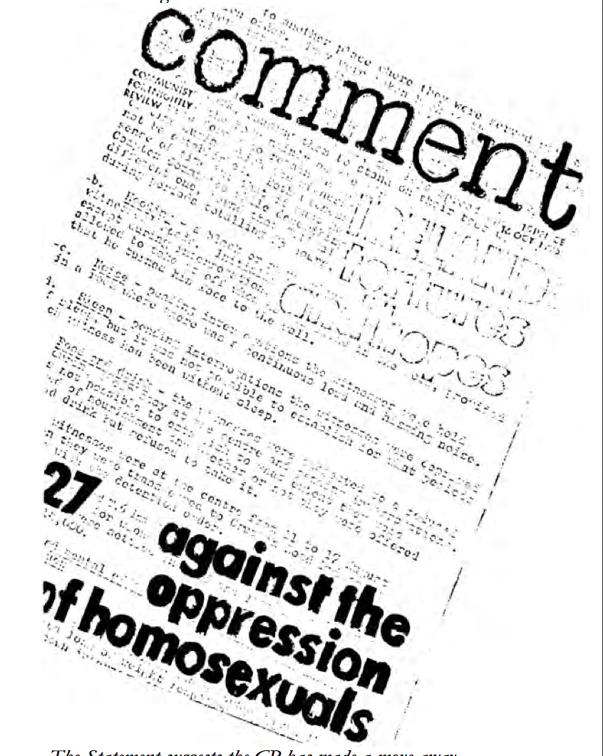 Prior to the EC statement, Comment (3 April, 1976, p. 108) featured in its regular ‘Viewpoint’ column a piece by John Gowling, a leading member of the Young Communist League, on the Party’s attitude towards gay rights. Gowling started the piece with: