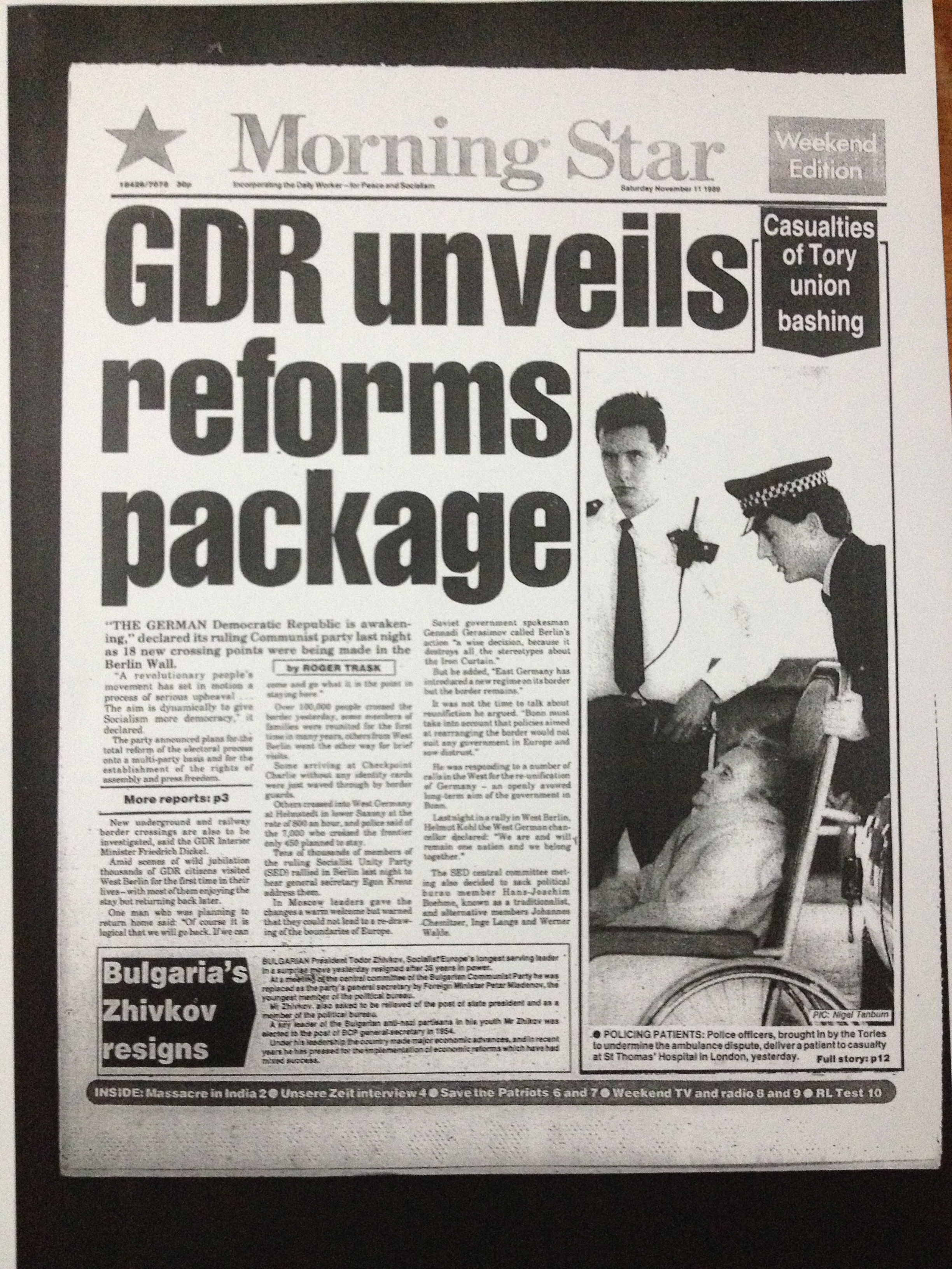 On the night of 9 November, the Berlin Wall began to collapse. The Morning Star first reported it on 11 November under the headline ‘GDR UNVEILS REFORMS PACKAGE’. Roger Trask quoted the ruling Socialist Unity Party (SED) who were putting their spin on the rapidly unfolding events (announcing 18 new crossing points):