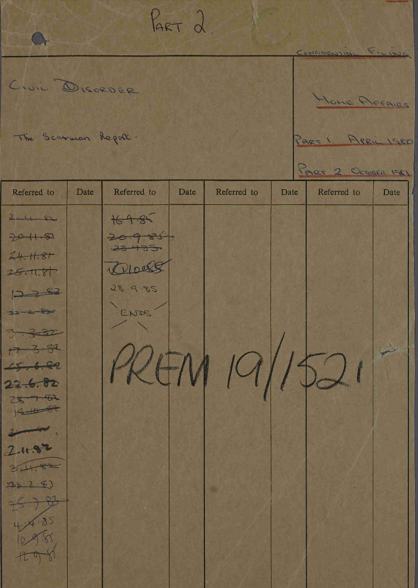 The National Archives have just released archival documents relating to the Thatcher government for 1985 and 1986, with further releases in July 2015. There have been many media reports already on many other aspects of the papers (such as the introduction of the Poll Tax in Scotland, the Anglo-Irish relationship and her love-hate relationship with Australian PM, Bob Hawke) but I thought I’d explore one of the digitised files that has been so far overlooked – a file on public disorder and the aftermath of the Scarman Report on the Brixton Riots, spanning from late 1981 to late 1985 (PREM 19/1521).