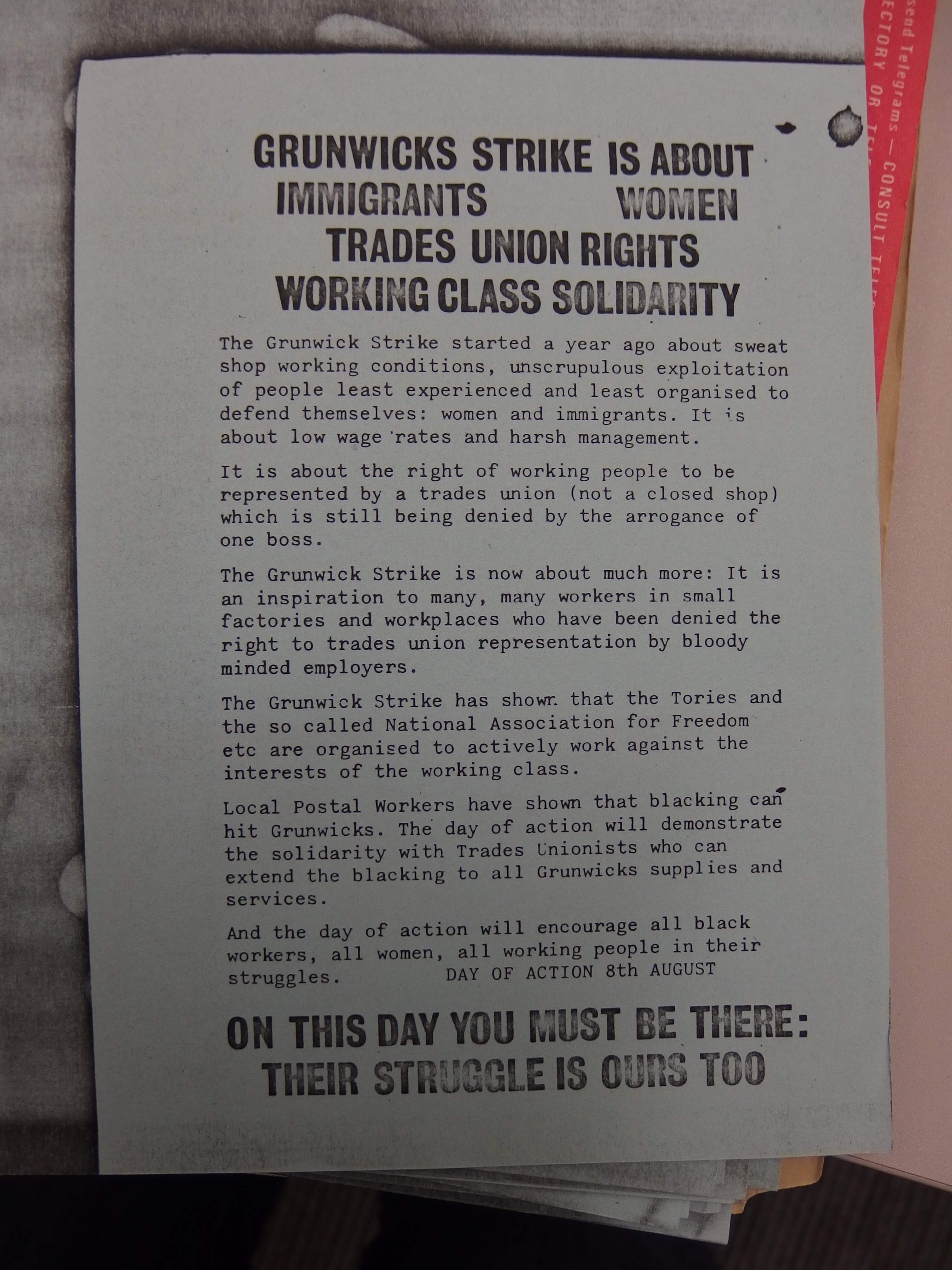 From Todpuddle to Tonypandy, from the Match Girls to the Miners, working people have fought for the right to organise. Trade Unionism is now under attack at GRUNWICK. A defeat for us would be a defeat for the whole working class.[3]