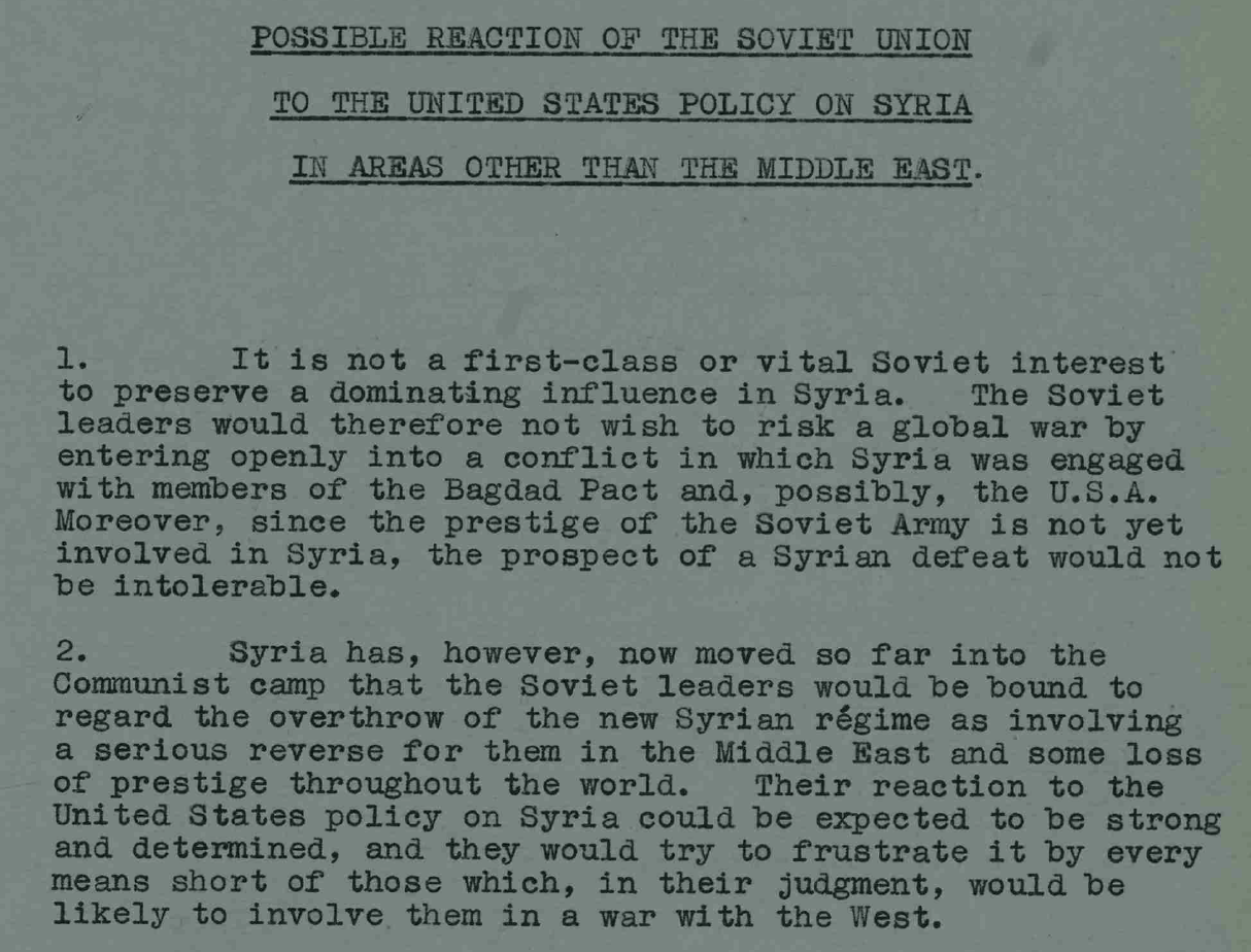 From this, the British prepared a document looking at the repercussions from the Soviet Union if the United States did invade Syria. Probably the largest threats that the British believed might arise from a US invasion would be Soviet aggression towards Turkey, Jordan and Iraq, as well as the encouragement of further hostilities towards Israel or the assassination of one of the leaders of a US ally in the Middle East, such as King Hussein, Nuri as Said, Camille Chamoun or King Saud. There was a fear that the Soviets would also forment rebellions in Yemen and Oman.