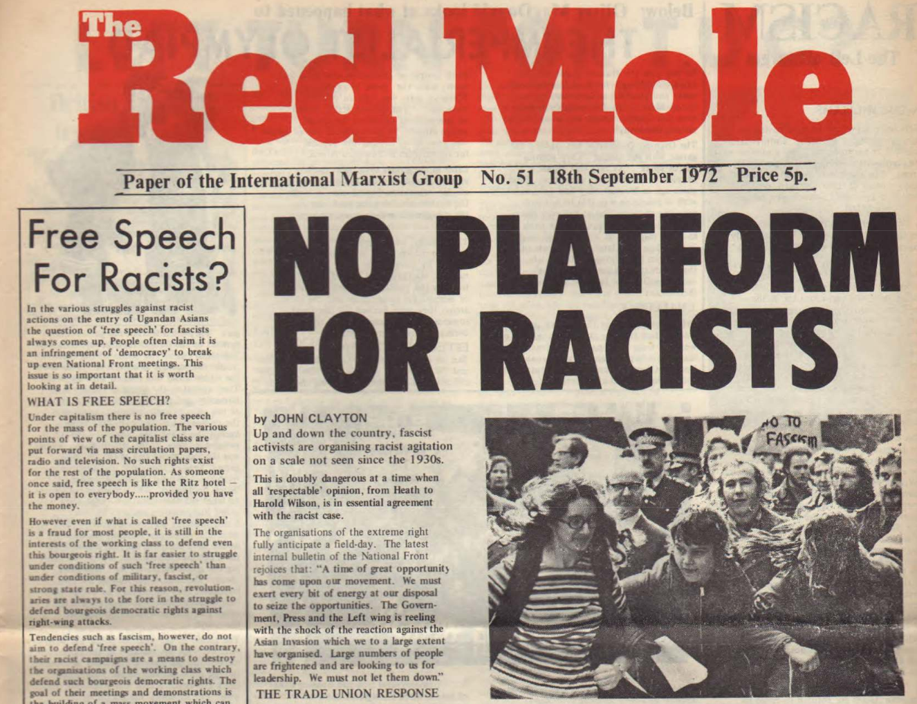 Forming in 1967, the National Front brought together a number of disparate fascist and anti-immigration groups and by the early 1970s, it was making headway by attracting disaffected Conservative Party voters who felt that the Tories were ‘too soft’ on immigration. Particularly when the Ugandan Asian controversy emerged in 1972, the NF publicised its opposition to letting these British citizens into the country after the Heath government acknowledged that it had legal reason to deny them entry. The first use of the term ‘no platform’ (that I have been able to find) comes from that year. The Red Mole was the newspaper of the International Marxist Group (IMG), a Trotskyist organisation that built quickly amongst the student and anti-Vietnam War movements in the late 1960s. In the issue for September 18, 1972, the front page headline declared ‘NO PLATFORM FOR RACISTS’. It described the NF and the Monday Club (a pro-empire and anti-immigration grouping within the Conservative Party) as ‘mortal enemies of the working class’ and stated that these two groups ‘must be stopped in their tracks’. The newspaper argued that these groups needed to be confronted and were ‘not going to be convinced by rational argument’, calling for ‘a concerted counter-attack’ at meetings of both groups.