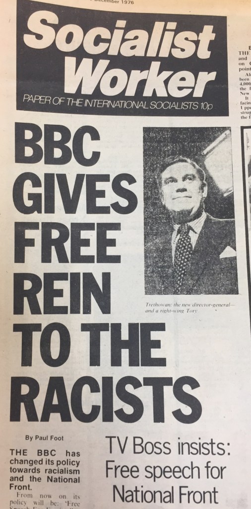 While the BBC denied Mosley a platform, it did give airtime to other fascists at different points throughout the post-war era. In 1959, the BBC show Panorama interviewed the White Defence League’s Colin Jordan.[5] John Tyndall and Martin Webster were both interviewed in the 1970s at the height of the National Front, which were condemned by the National Union of Journalists (NUJ).[6] Furthermore both BBC and ITV aired electoral broadcasts for the NF at the 1974 and 1979 elections.