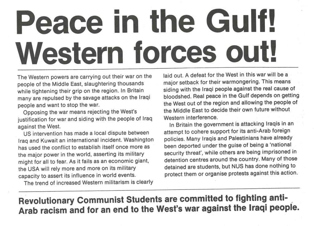 Peace in the Gulf! Western forces out! Revolutionary Communist Students manifestos for 1991
