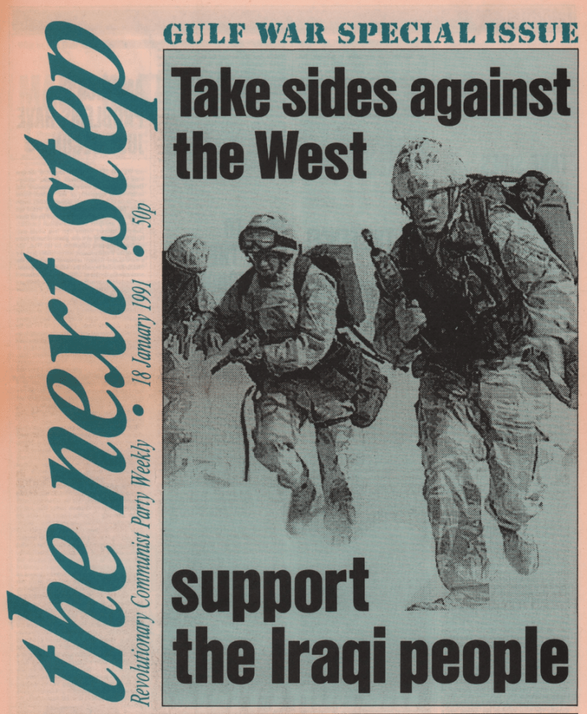 Prior to January 1991, the RCP argued that it did not support the Iraqi invasion, but also did not recognise Kuwait’s right to self-determination and that the most pressing problem was the possibility of Western intervention (The Next Step, 7 September, 1990, p. 5). After the Western invasion, the RCP swung behind Iraq, proclaiming ‘peace can only come about through the defeat of Western imperialism at the hands of the Iraqi people. That is why we take sides with Iraq in the Gulf war’ (The Next Step, 1 February, 1991, p. 1). The RCP lamented other groups on the British left for not opposing US imperialism more forthrightly, although the aim of their ire was the CND, which allegedly called for Iraq out of Kuwait, alongside US/UK out of the Gulf, raising the spectre of nuclear weapons in the post-Cold War era.