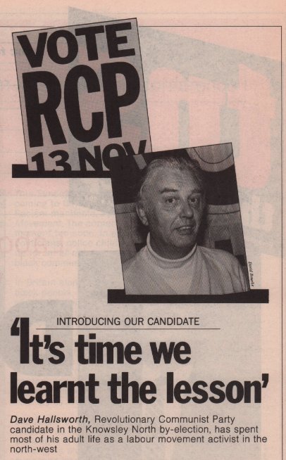 The RCP put forward Dave Hallsworth as a candidate, who had previously run in the 1983 election. Hallsworth campaigned heavily on the notion that despite Howarth being put in place as Kinnock’s man for Labour, ‘local people will not have to vote for the candidate that nobody wanted’ and that with Hallsworth and the RCP, people would ‘be able to support a candidate who stands for a struggle to win what the working class needs.’[2] The RCP portrayed the by-election as a ‘practice match’ for Labour in the lead up to the 1987 general election and that Kinnock’s Labour was using Merseyside, including the constituency of Knowsley North, as ‘a convenient piece of wasteground on which to kick the local labour movement around’, using the presence of Militant as the pretext.[3] The RCP saw Militant as ineffectual and too dependent on the Labour Party machinery to seriously challenge the party, so promoted themselves as the only real alternative for the working class on Merseyside and beyond, stating: