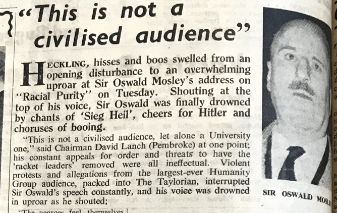 Violent protests and allegations from the largest-ever Humanity [sic] Group audience, packed into The Taylorian, interrupted Sir Oswald’s speech constantly, and his voice was drowned in uproar…[26]