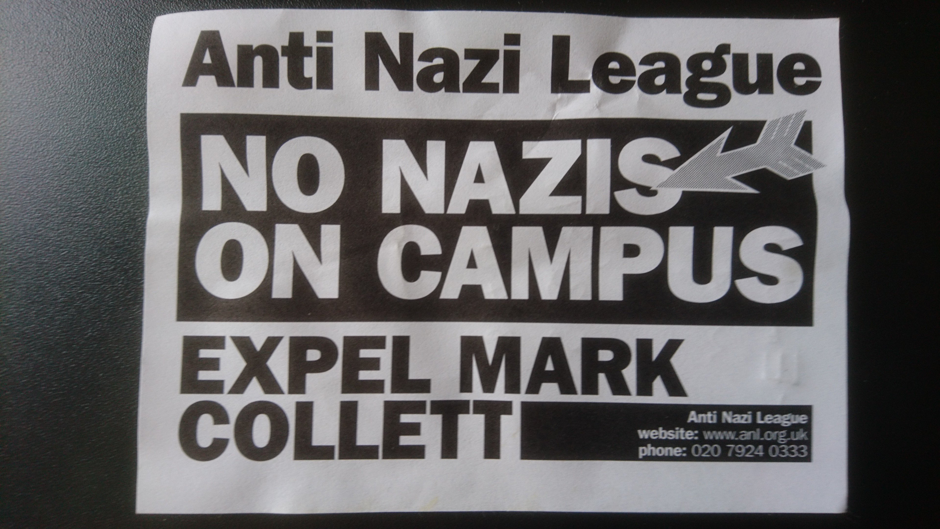 We… are shocked and appalled that a student at Leeds University, Mark Collett, is now the fuhrer of the youth wing of the British National Party. While the BNP may be currently trying to cultivate a veneer of respectability, the fact is that they remain a neo-Nazi group whose members admire Hitler, deny the horror of the Holocaust, and stir up race hatred wherever they organise. We therefore demand the following,