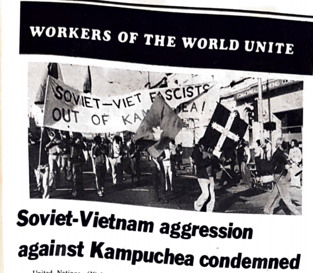 By 1980, the CPA (M-L) line had become not just a defence of the previous regime of Democratic Kampuchea and demonisation of the Vietnamese occupation of Cambodia, but also support for the ‘united front’ of the Patriotic and Democratic Front of Great National Union that the former Democratic Kampuchea leaders were fostering. In this period, Hill, who had briefly visited the country, and the CPA (M-L) more broadly championed Democratic Kampuchea and its supposed combination of patriotism, anti-imperialism and socialism. The violence of the regime, if acknowledged at all, was downplayed and compared with the violence inflicted upon the country by the French, the United States and the Vietnamese.