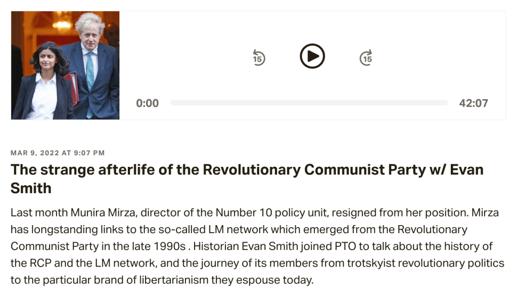 I am happy to announce that I was interviewed by the Politics Theory Other podcast recently about the history of Revolutionary Communist Party, Living Marxism and Spiked. That episode is currently freely available via the PTO Patreon page and should be on other podcast feeds in the near future. I hope you check it out!