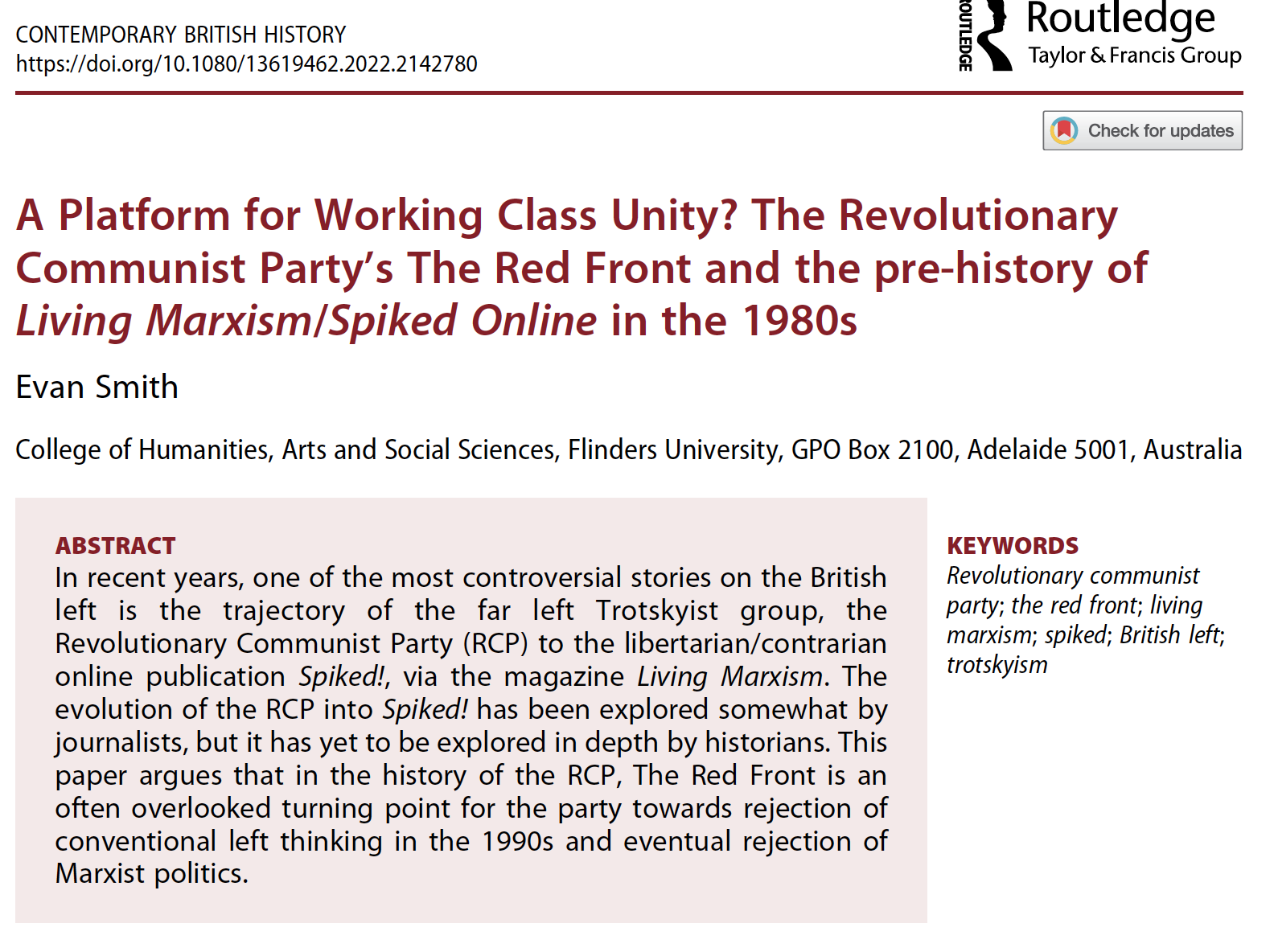 This is just a quick announcement that my article on the Revolutionary Communist Party’s The Red Front has been published by Contemporary British History journal. I started working on this in 2017 and the final article is over 20,000 words. You can find it here.