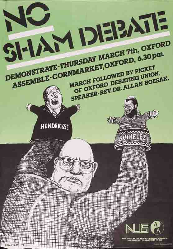 In March 1985, Steyn’s successor Denis Worrall was invited to a debate on South Africa by the Oxford Union, alongside the South African ‘coloured’ cabinet minister Allan Hendrickse and Bantustan leader, Chief Gatsha Buthelezi.[11] Following a protest by Oxford students and the local branch of the AAM, all three withdrew from the debate, which was subsequently cancelled.[12]