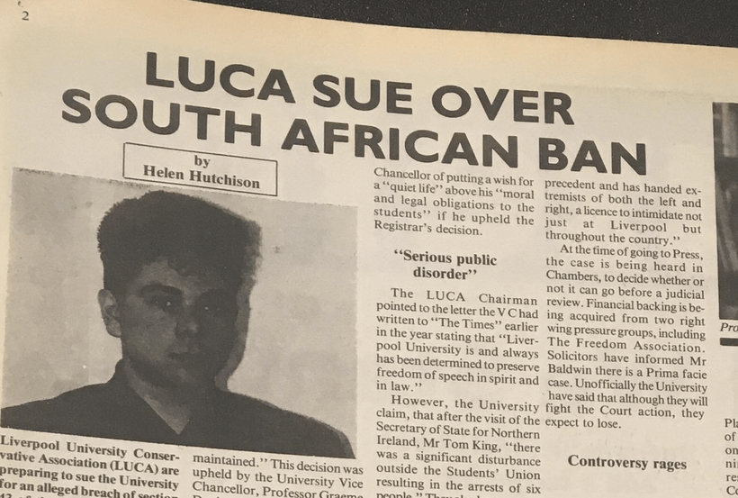 The out-going Chairman of the Conservative Association at Liverpool University, Joe Baldwin, accused Davies of ‘moral cowardice’ and blasted the university for the decision to force the cancellation of the meeting in December 1988: